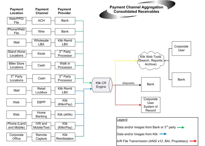 Consolidated Receivables is a comprehensive payment integration solution. Regardless of the payment channel or payment type, Klik consolidates the payments data and provides billers with a single electronic posting file in a consistent format for simple, easy posting of receivables. Reports are available daily on a secure Web portal and provide all payment related details by payment channel.