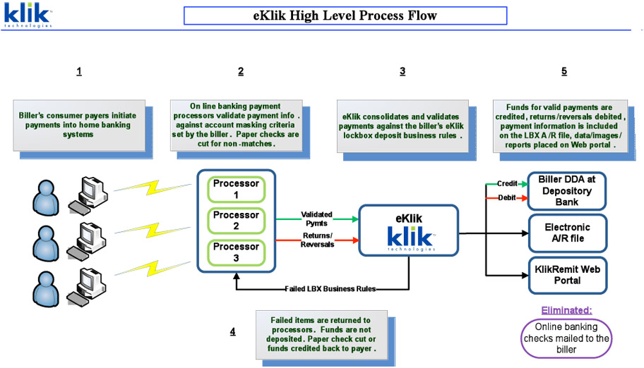 By consolidating online payments from all bill service providers, eKlik increases billers' straight-through electronic payment processing rate and eliminates the need to juggle multiple relationships involving contracts, pricing, data feeds and account reconcilement.